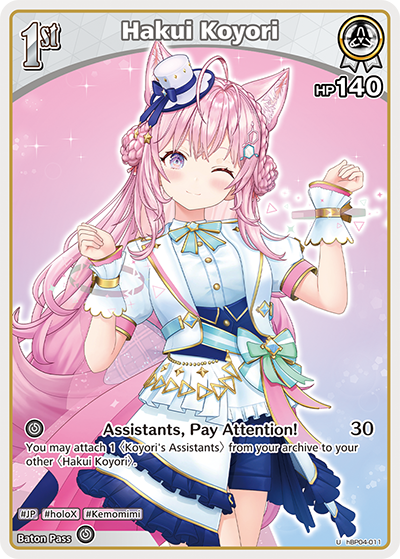 hBP04-012 [Hakui Koyori] can search for a support card with the "#KOYO LABO" tag through her bloom effect, and when equipped with hBP04-105 [Koyori's Assistants], she allows you to draw a card when using Arts, making her extremely powerful.