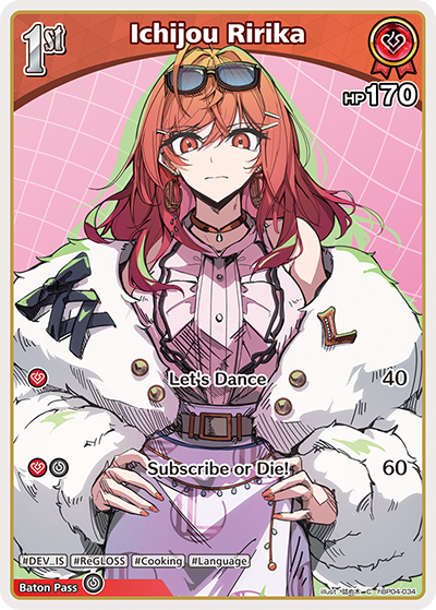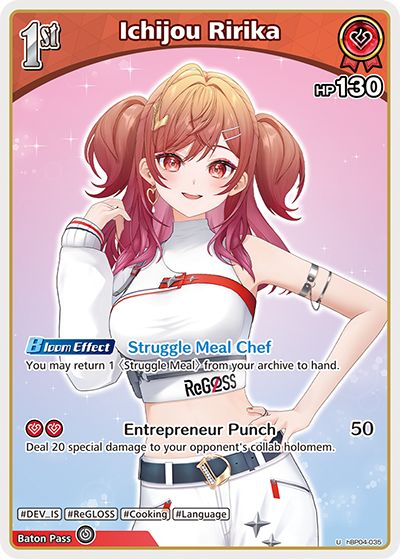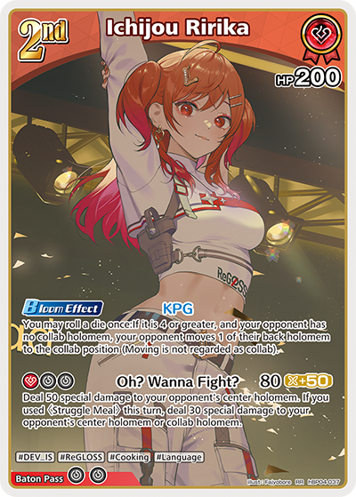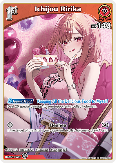 When one of your holomem is downed by your opponent’s holomem, use the SP Oshi skill "Cute! Positive! Genius!" to gather hBP04-037 [Ichijou Ririka] and hBP04-091 [Struggle Meal] into your hand.
