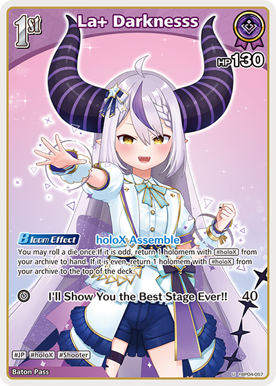 Use hBP04-089 [Two-Tone PC] to search for the 1st holomem of [La+ Darknesss] and [Takane Lui], and prepare for the late game by setting up turns where you can roll a die more times when you bloom into 2nd [La+ Darknesss].